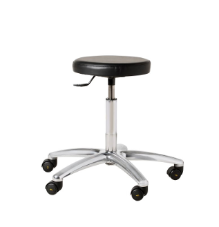 ESD-compliant stool designed for clean production environments. The dissipative construction ensures safe discharge of static electricity. The seat is made of conductive vinyl, providing a durable and easy-to-clean surface suitable for environments with high hygiene requirements. The stool features a stable five-star base in chromed aluminium and is equipped with five soft, conductive, self-braking castors. Height adjustment is smoothly operated via a safety gas lift, with a range of 500–640 mm, ensuring ergonomic flexibility. The stool is marked with an ESD symbol.