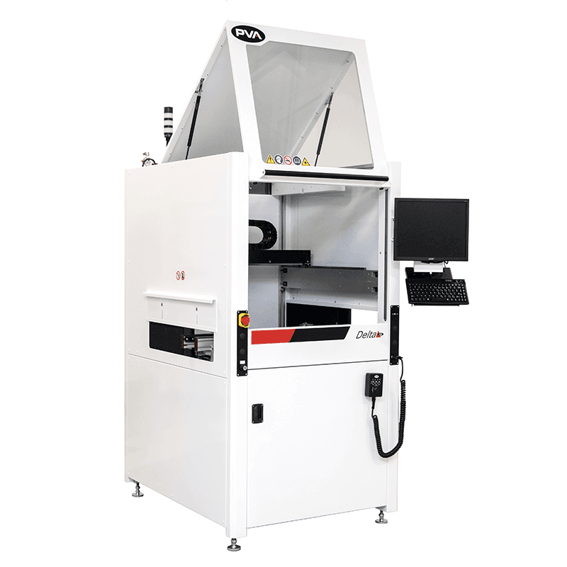 The Delta 6 is a new, reimagined flexible robotic conformal coating and dispensing system, ideal for selective coating, potting, bead, and meter-mix dispensing applications. It features a robust overhead three-axis motion platform suitable for both inline and batch operations. While maintaining the preferred features of previous workcells, the Delta 6 has been designed with a slimmer footprint, improved structural and gantry rigidity for enhanced robustness, and easier access. The system offers numerous options and integrated features, including a patented servo-controlled optional four-axis motion with valve tilt and rotation, closed-loop process control throughout the gantry, the ability to handle multiple dispensing applications or materials in a single cell, an onboard PC for unlimited program storage, and exclusive PVA programming software designed specifically for the Delta 6.